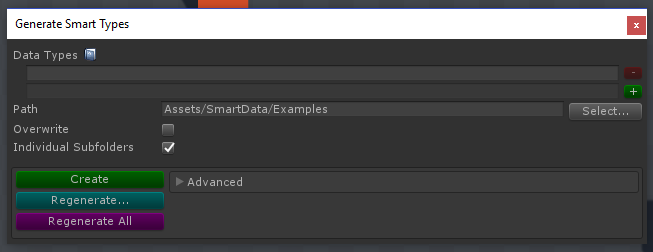 Due to Unity's serialization limitations, it's necessary to create a new set of classes for each type you want to support. SmartData makes this simple with the SmartType generator tool. To launch it, right-click in the Project panel or Assets on the top menu, then Create > SmartData > Generate Types.