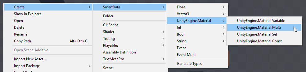 SmartData comes with various built-in SmartTypes, for basic types such as float, int and string. Creating SmartObject assets of these types is performed through the Create menu, and the SmartRef classes are used to reference them in code.