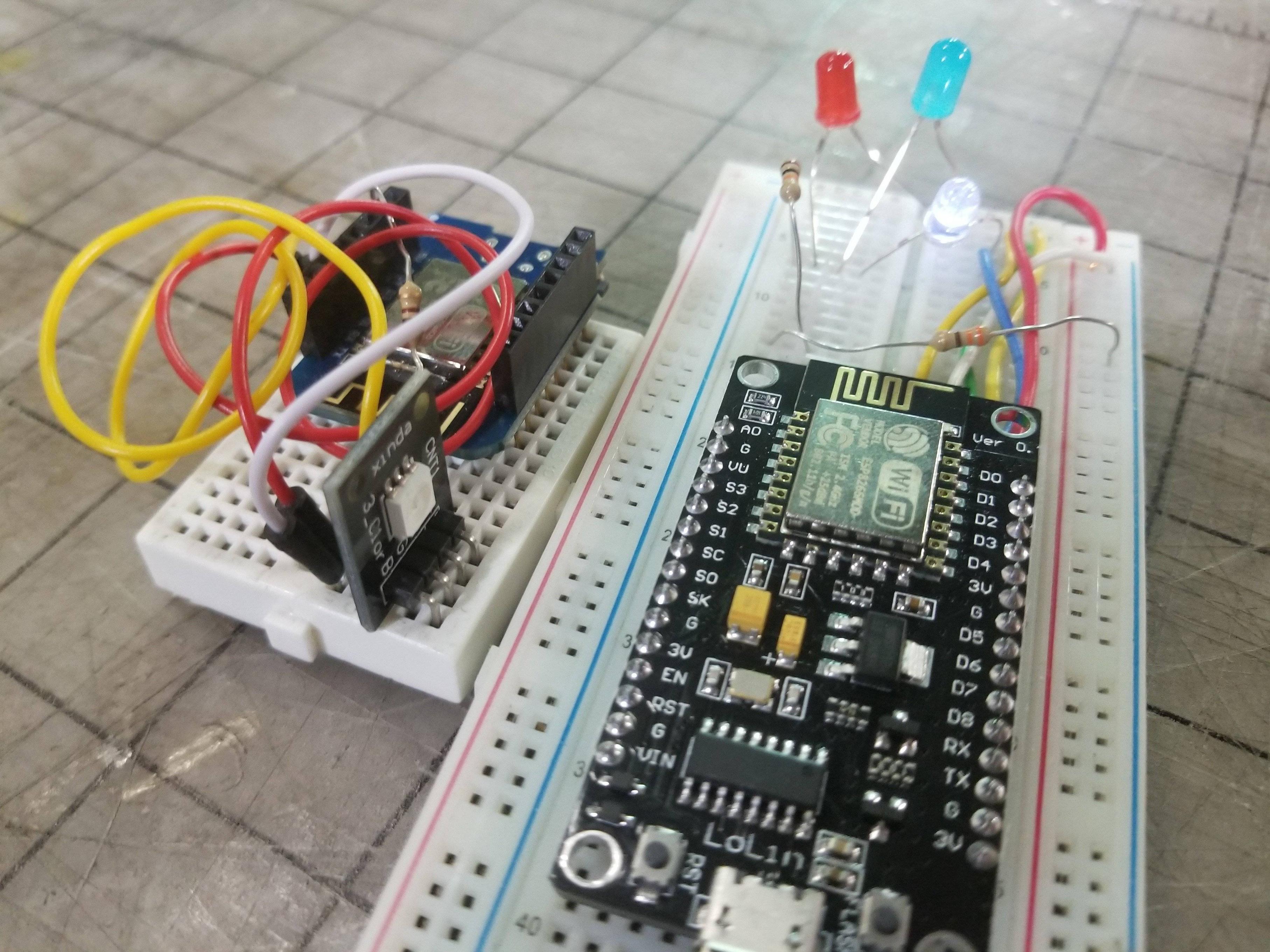 We need a device to create a Wi-Fi access point to hack, called a Chicken. For this, we'll use a ESP8266 based device, like the D1 mini or NodeMCU. We'll also need a breadboard, a 330 ohm resistor, and one green, blue, and red LED.