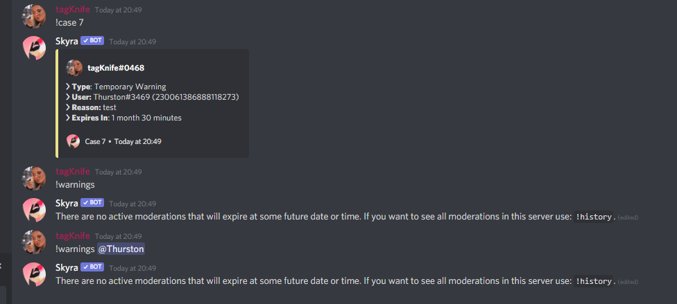 When running the !warnings command with or without a user param, the warnings command always says there are no warnings active.