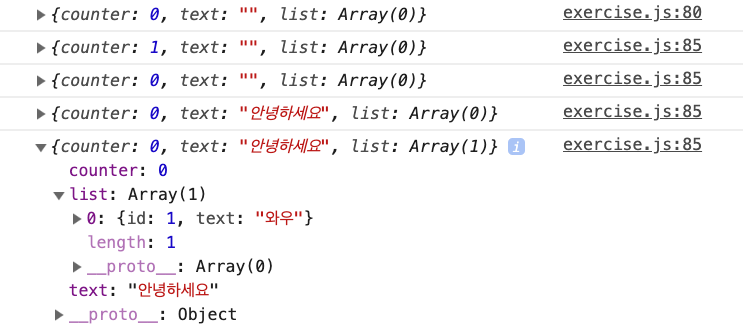 store.dispatch(addToList({ id: 1, text: '와우' }));리덕스 스토어 안의 상태는 액션이 디스패치됨에 따라 업데이트됩니다. 위 코드에서는 우리가 listener라는 함수를 만들어서 리덕스 상태에 변화가 생겼을 때 마다 콘솔에 상태를 출력하도록 처리하였습니다.
