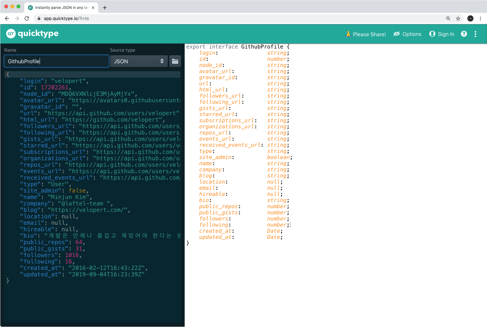 물론, 때에 따라 변환된 것을 그대로 복사해서 사용하면 안되고, 일부 값들은 수작업으로 조금 변경을 해줘야 할 수도 있습니다. 예를 들어 제가 복사한 JSON 안에 있는 email 값은 현재 null이지만, GitHub API 토큰을 사용하여 인증된 계정을 통해 API 를 요청하게 되면 email 쪽에 문자열이 올 수도 있습니다. 여러분이 만약 실무에서 타입스크립트를 사용하고, 백엔드와 연동을 하게 될 때에도 비슷한 상황이 있을 수 있겠지요? 때문에 변환된 인터페이스를 그대로 사용하면 안되고, 실제 사용 케이스에 맞춰서 조금씩 변경해야 할 필요가 있을 수도 있다는 점 잘 기억해두세요.