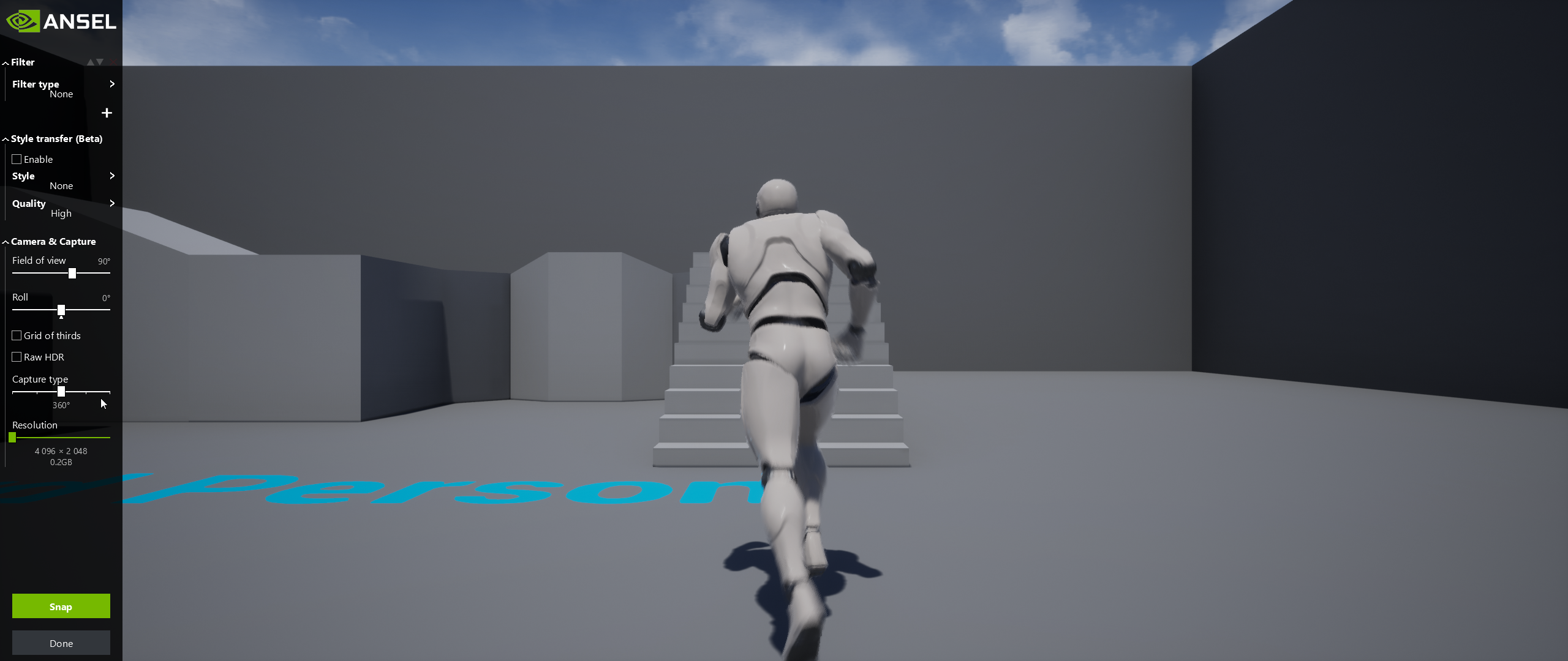 After the setup is complete, click on 'Launch' (the plugin will not work in PIE mode) and as soon as the Ansel interface opens, select the 360 (or 360 stereo) screenshot mode and click on 'SNAP'. Now do not move your mouse out of the snap button and let the plugin do its work. (remember, it is a slow task, various seconds for each frame)