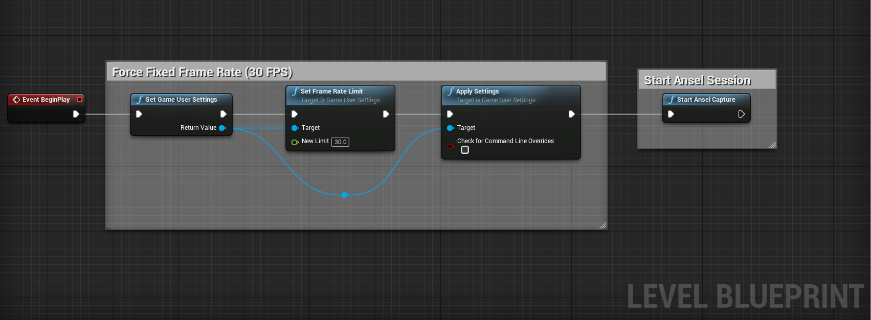 Two Blueprint UFunctions are exposed: "Start Ansel Capture" and "Stop Ansel Capture"