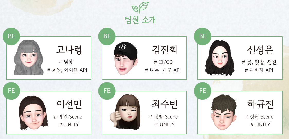 | 역할 | 팀장 / BackEnd / Unity | BackEnd / Unity | BackEnd / Unity | 부팀장 / Unity | Unity | Unity |