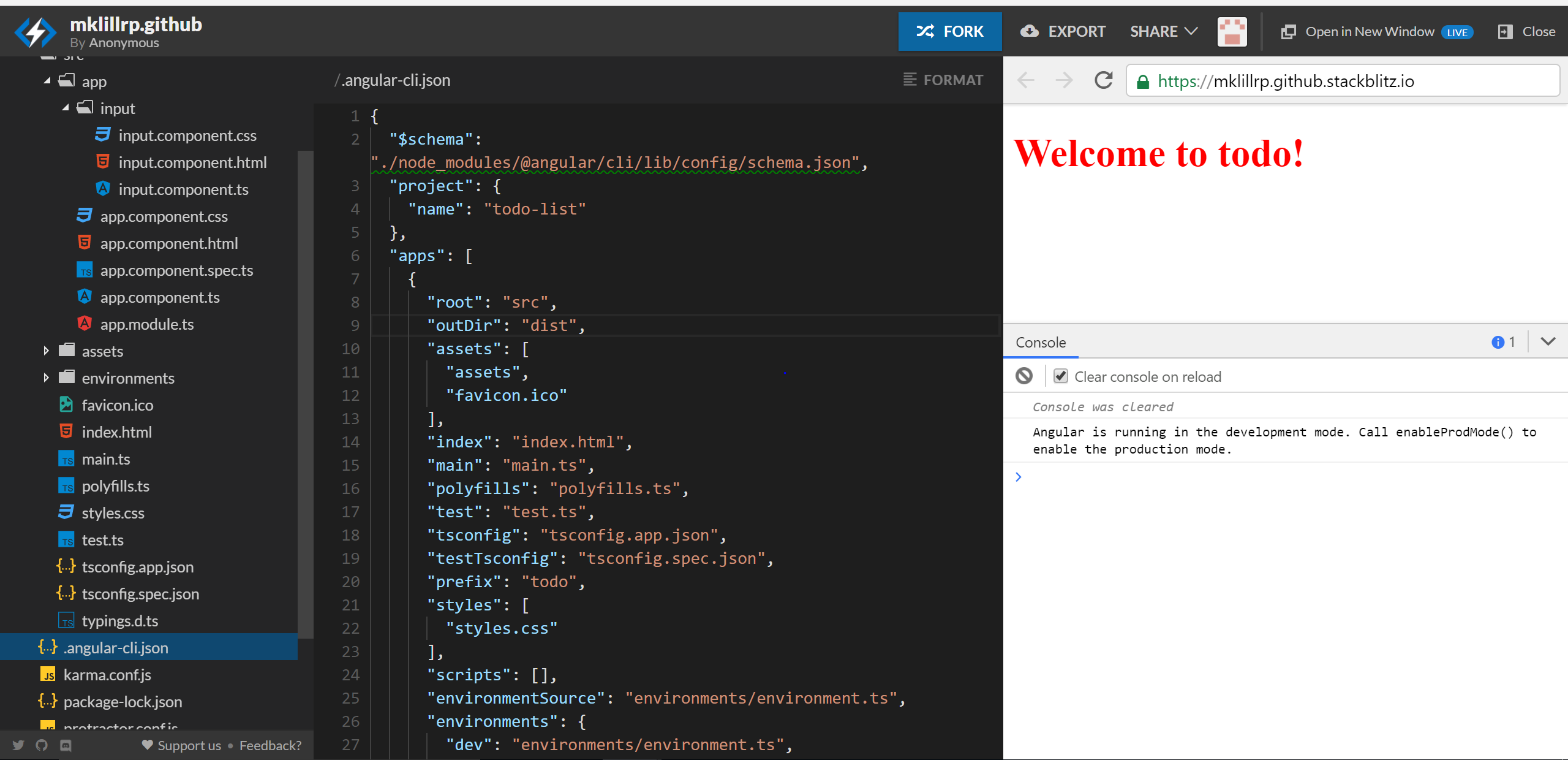 I created a new component called 'input' whose selector should have been 'todo-input' because the prefix specified in the .angular-cli.json file is 'todo'. However, the generated component still has the prefix as 'app' which is the default prefix.