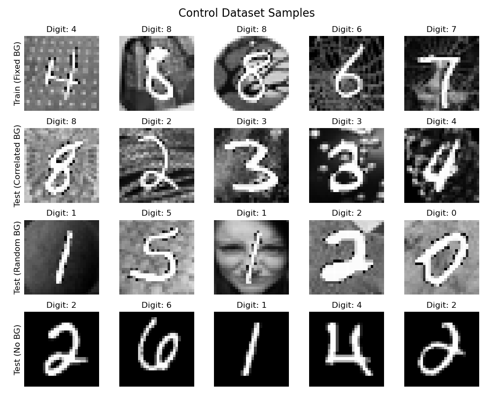 This blog introduces a control dataset designed to test this property. The dataset combines two image datasets, Describable Textures Dataset (DTD) and MNIST, by replacing the MNIST backgrounds with textures from DTD.