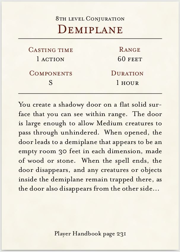 While Dungeons and Dragons is great fun, it can be a chore to wade through the Player's Handbook to find out what one of your spells does. This tool attempts to make this easier by allowing you to create a deck of spells; a pile of cards with all your spells and the most important information about them so you can speed up the game.