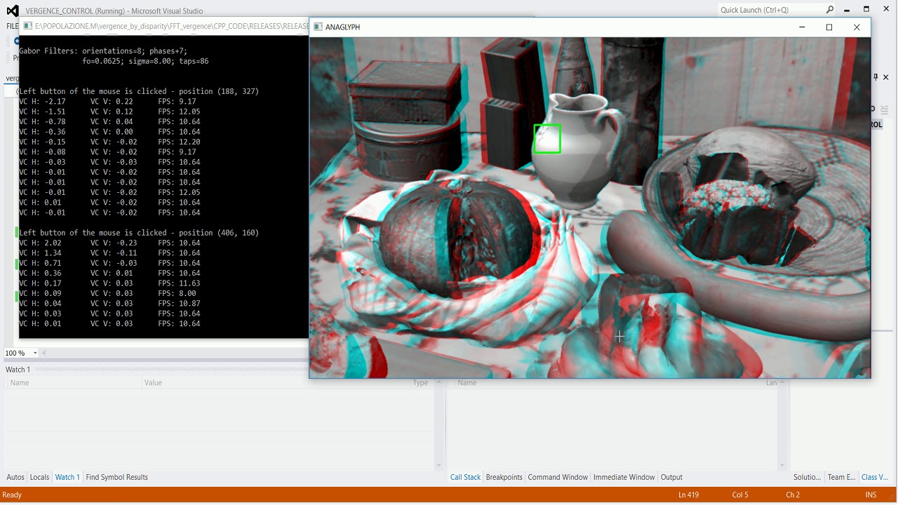 The source code is provided with an application example that loads a stereo pair from the Genoa Pesto Database. In the demo, the stereo pair is shown in anaglyph mode, and the robot fixation is simulated by the user clicking with the mouse cursor on the desired fixation point. The vergence control is then computed at fixation and vergence eye movements are simulated shifting the images proportionally to the control. If the control is working properly, the anaglyph at fixation turns to gray scale.