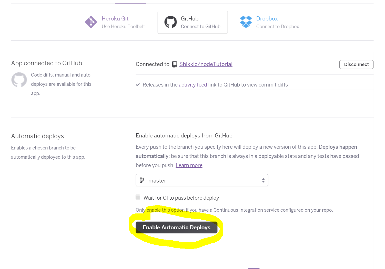 We want to be able to have any changes we push to github automatically deploy, so lets enable this feature by click the Enable Automatic Deploys