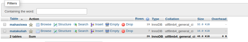 Jangan lupa untuk membuat dua table dengan nama mahasiswa & matakuliah