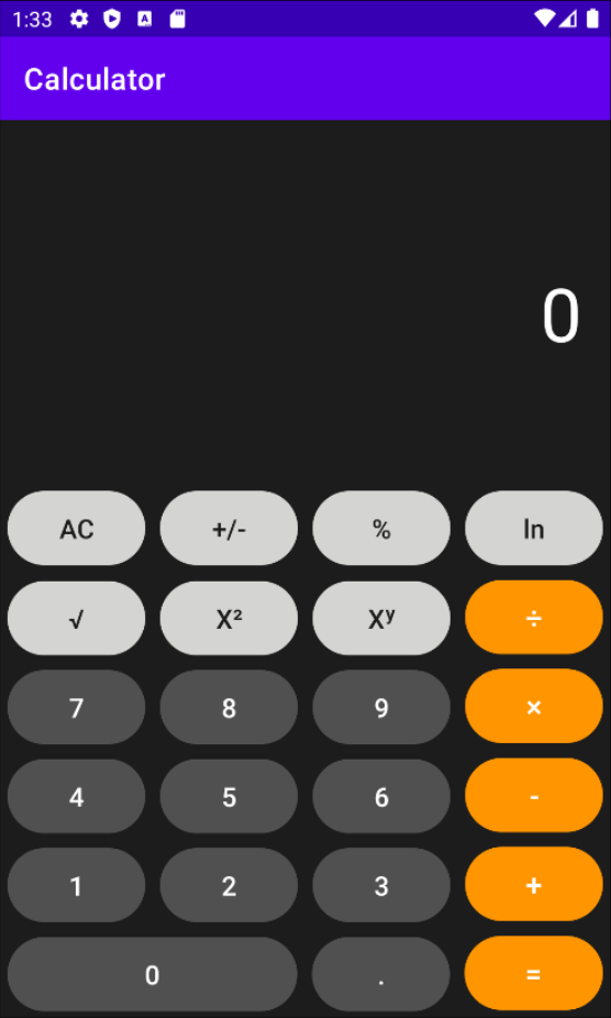 - 23 buttons including numbers 0 to 9, addition (+), subtraction (-), multiplication (*), division (/), decimal point (.), equal sign (=), percentage (%), sign (+/-), square root (√), square (X²), power (Xʸ), natural logarithm (ln), and all clear (AC)