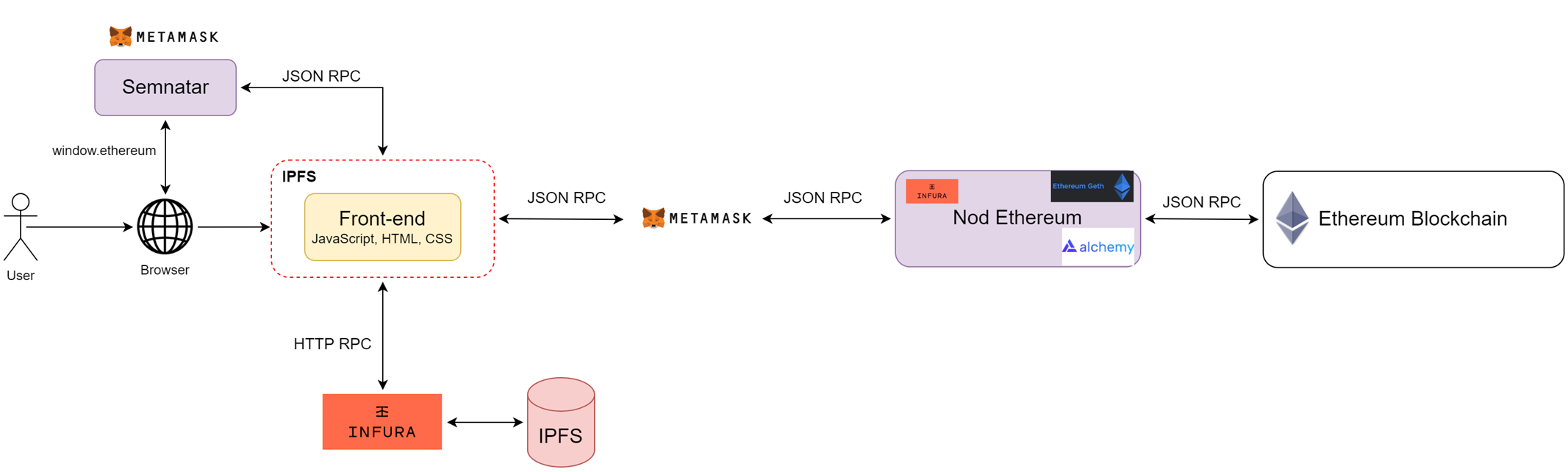 The solution runs on local blockchain (Ganache) and local IPFS node. http://127.0.0.1:8080/ipfs/QmNUioja47pJCbfx1VaJZp917on5JGGaeFPxTGx9bTbCLp/
