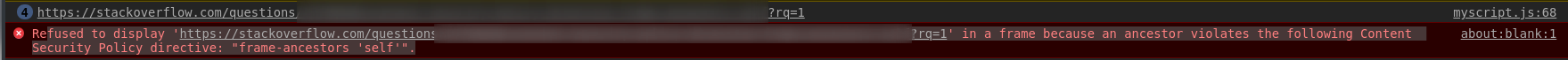 fused to display 'https://stackoverflow.com/questions/.../...?rq=1' in a frame because an ancestor violates the following Content Security Policy directive: "frame-ancestors 'self'".