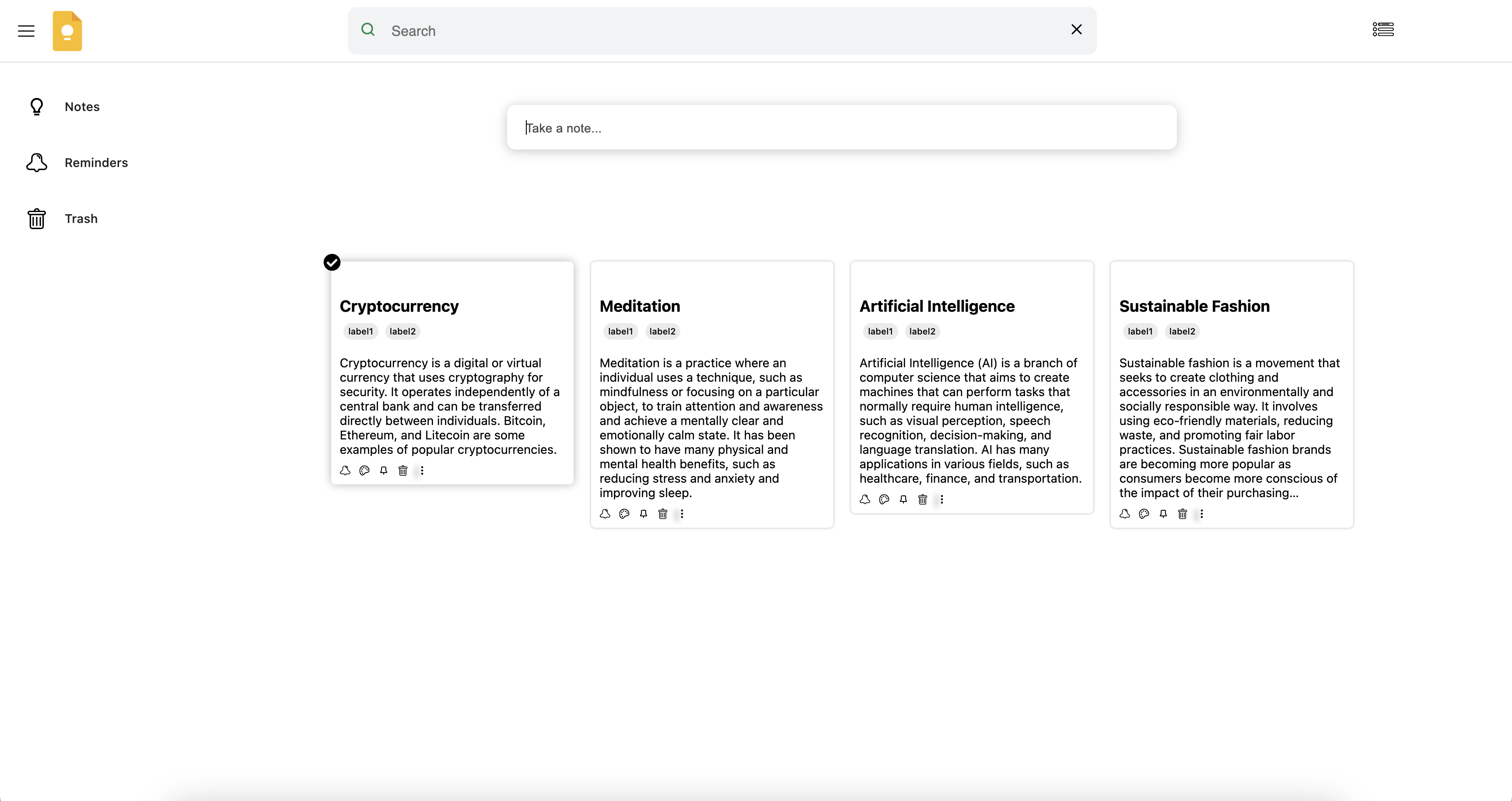 google-keep-clone Google Keep Notes A client and server model to feed real-time notes. Using graphql subscriptions, pub sub and web sockets. Client: React Js Server: Graphql Steps to start on local env: Clone Run npm install on client and server. Run npm start on client and server. Graphql query platform