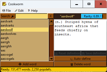 Once the program loads the files, you should see a list of words in the left pane. The bottom of the window shows the current number of words and popdefs in memory when idle, and status information on any currently running threaded operations.