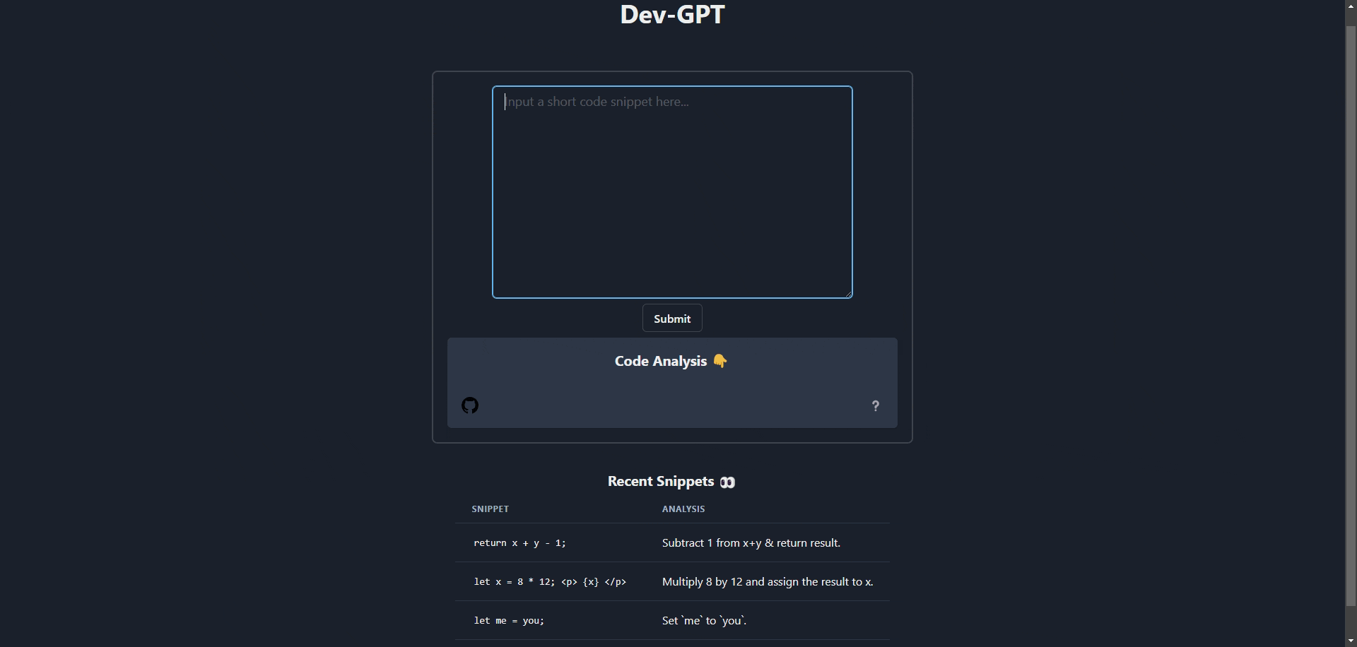 A simple demo app to analyze code snippets in seconds utilizing the power of ChatGPT/OpenAI, snippets submitted and answers received by other users are viewable at the bottom portion of the UI