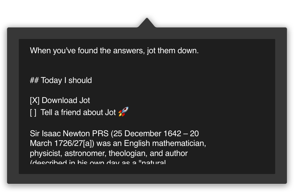 Jot The random piece of paper that lives in your Mac menubar. https://getjot.app Get prebuilt app from https://gumroad.com/l/WseNv