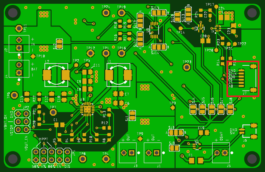 while S3 is connected to the output of the CSA measuring the bq25570 buck converter output current and S4 is connected to the output of the CSA measuring the bq25570 boost charger input current. The following image shows the location of connector J7, which contains the A0 and A1 inputs.