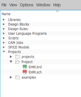 When opening EAGLE for the first time, navigate to the Options > Directories tab in the top-left corner. A pop-up window will appear. It is here that you must now add the location of the project files in order to open them in EAGLE. Go to the Projects field and add the absolute location of the EHM\Project folder, seperating it from the default project location with a semicolon ;.