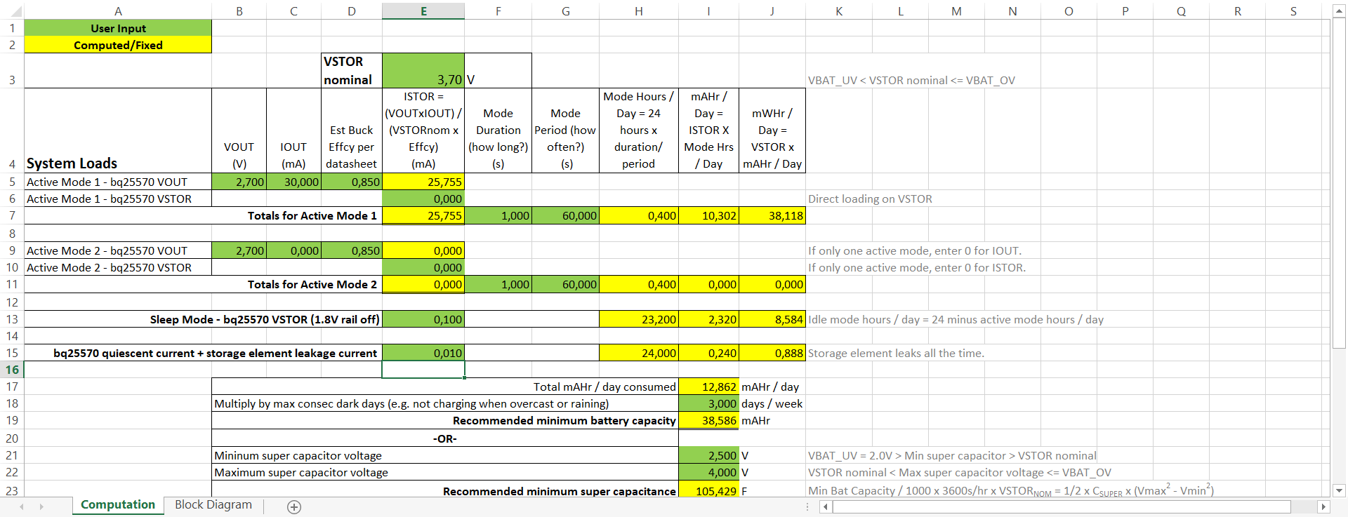 Choosing an appropriately sized solar panel and storage element (most likely a 3.7V battery) is not an easy feat and depends heavily on your use case. Luckily I've provided another handy spreadsheet (EHM\bq25570SolarAppDesignExample_V1p3.xlsx) which accepts a number of parameters and calculates the required size of your solar panel as well as the minimum battery capacity required (given a nominal voltage). I've loaded the spreadsheet with some parameters that reflect the absolute worst case scenario for a sensor node that uses every possible function of the hardware (including chips other than the BQ25570) to repeatedly send a message every 60 seconds.
