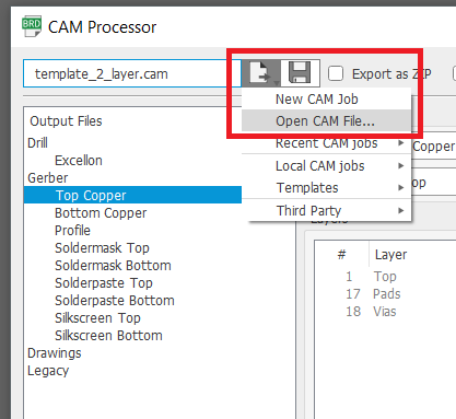 In case you've made changes to the board layout, you'll need to generate new Gerber files. These files tell the machines of your PCB manufacturer of choice how to lay out all traces and other stuff exactly how you designed it. In order to do this, open the board layout window and navigate to the File > CAM Processor tab.