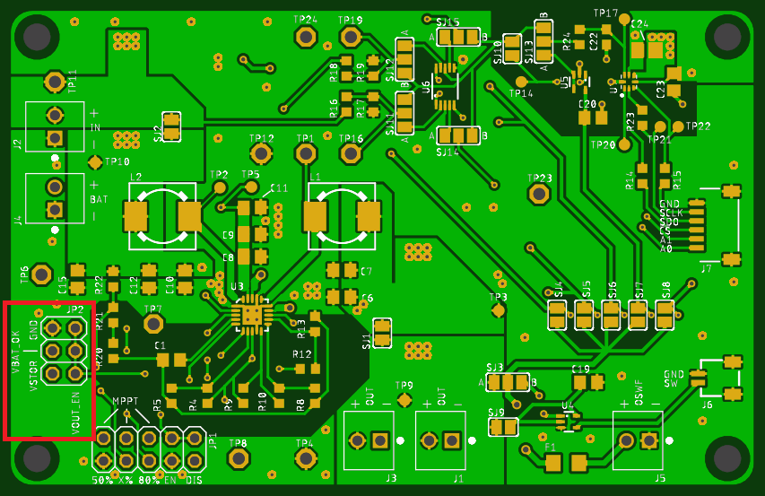Switching the MPPT percentage between 50% (VOC_SAMP = GND), 80% (VOC_SAMP = VBAT) or a custom value can be done by setting a jumper (see picture below) to the corresponding position on JP1. The same connector (JP1) also provides the ability to either enable or disable the entire chip by tying the NEN input of the IC to GND or VBAT respectively.