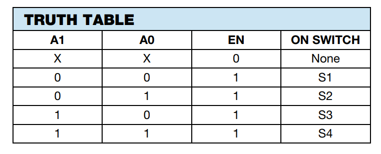 All signals that are to be sampled are multiplexed onto a single line just before the buffer-filter input with a EHM\Datasheets\dg2034e.pdf low rds-on 4 channel MUX. Since the input impedance of the buffer is very high, the additional resistance introduced by the MUX shouldn't result in significant attenuation of the signals. The following thruth table lists which input (denoted with S) is switched to the output according to the logical signal level on the A0 and A1 inputs.