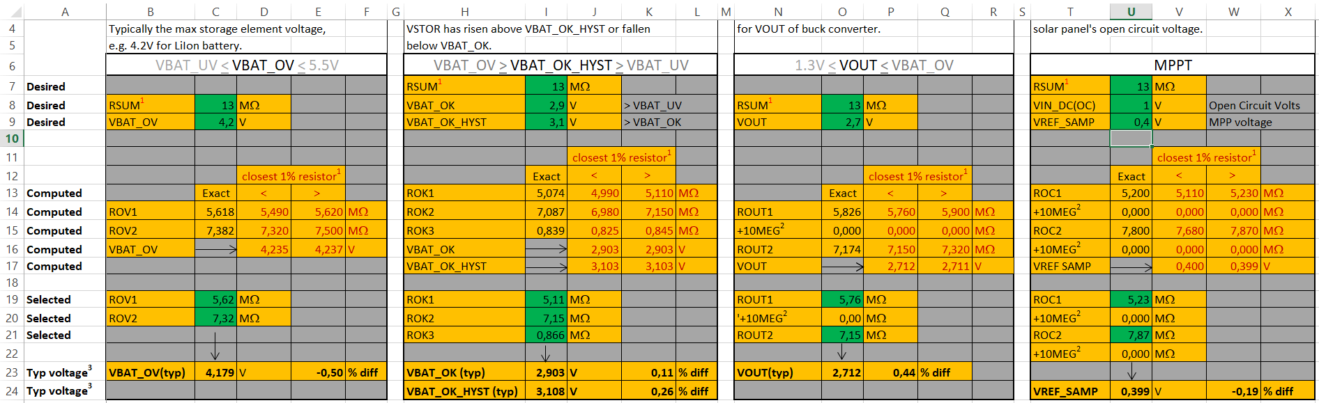 The EHM\BQ25570_Design_Help_V1_3.xlsx spreadsheet is a handy tool that calculates a set of resistor values that fits best within the operational constraints provided by you, the user. For your convenience I've provided you with some values that reflect a common scenario wherein a single cel Li-Ion battery or a dual cell NiMH battery are used as a storage element in conjunction with, e.g., a small solar cell (with an output voltage ≤ 3.5V) such as this one or this one (when space is limited) or this one when device footprint is no issue.