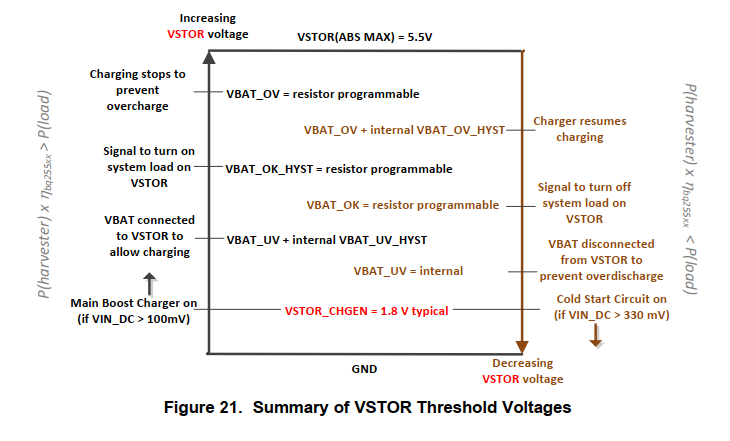 The cold start circuit's goal is to charge the voltage on CSTOR (i.e., VSTOR) higher than VSTOR_CHGEN so that the main boost charger can operate. When the VSTOR voltage reaches VSTOR_CHGEN, the main boost charger starts up. Once the VSTOR pin voltage goes above VBAT_UV (1.95V) plus the VBAT_UV_HYST threshold (15mV), the VSTOR pin and VBAT pins are effectively shorted through an internal PMOS FET. The switch remains closed until the VSTOR pin voltage falls below the VBAT_UV threshold. The VBAT_UV threshold should be considered a fail safe to the system and the system load should be removed or reduced based on the user-configurable VBAT_OK threshold which should be set above the VBAT_UV threshold.