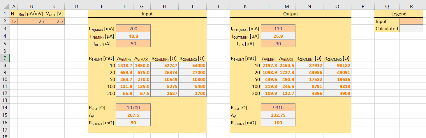 For your convenience I've added a spreadsheet in EHM\CSA_help.xlsx that combines all these calculations. This allows you to properly configure your current sense amplifiers based on the precision of your ADC (expressed as N bits) as well as the transconductance of the CSA and the output voltage (i.e., the positive rail of the ADC) of the bq25570 buck converter output. For example (see image below), with a 12 bit ADC one could increase the current measurement resolution significantly, at the cost of increased power consumption inherent to a more precise ADC that is.