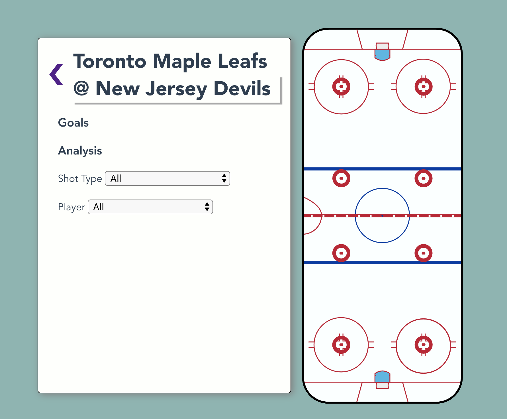 This is a prototype for an NHL live tracker which is woefully unusable at the time of writing due to league-wide shutdown. It consists of two layouts - one that displays the active NHL games, location and current score, and an expanded view which can then reveal data layers for types of shot and shot by player which looks like this:
