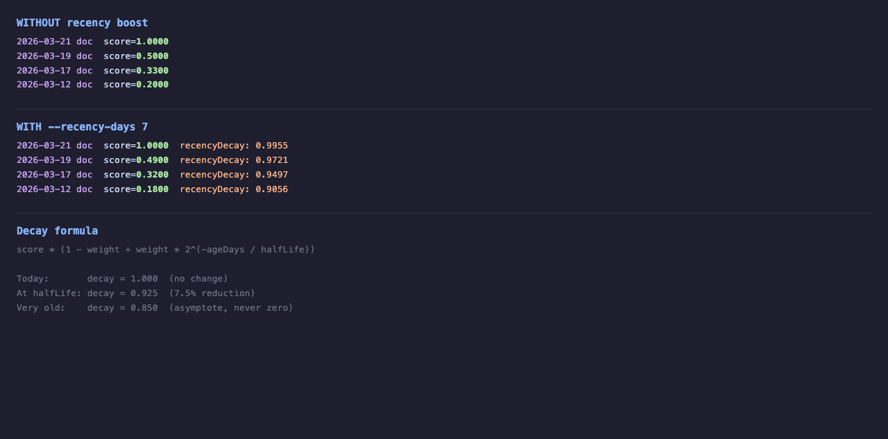 --recency-days 7, the March 12 document drops from 0.2000 to 0.1800 (10% reduction at ~9 days age with 7-day half-life), while today's document stays at 1.0000. TherecencyDecaymultiplier is visible in--explainoutput.Testing