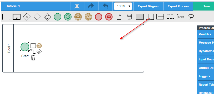 - In PM server, in designer panel, create a new process: 'Tutorial 1'