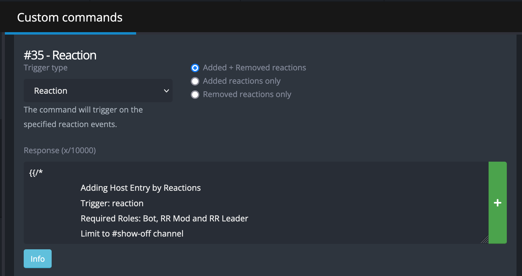Full disclosure: this is my first significant project, diving into custom commands and using YAGPDB's templating language. While it has been tested and seems to work fine, it comes with no guarantee that it will work perfectly for you.