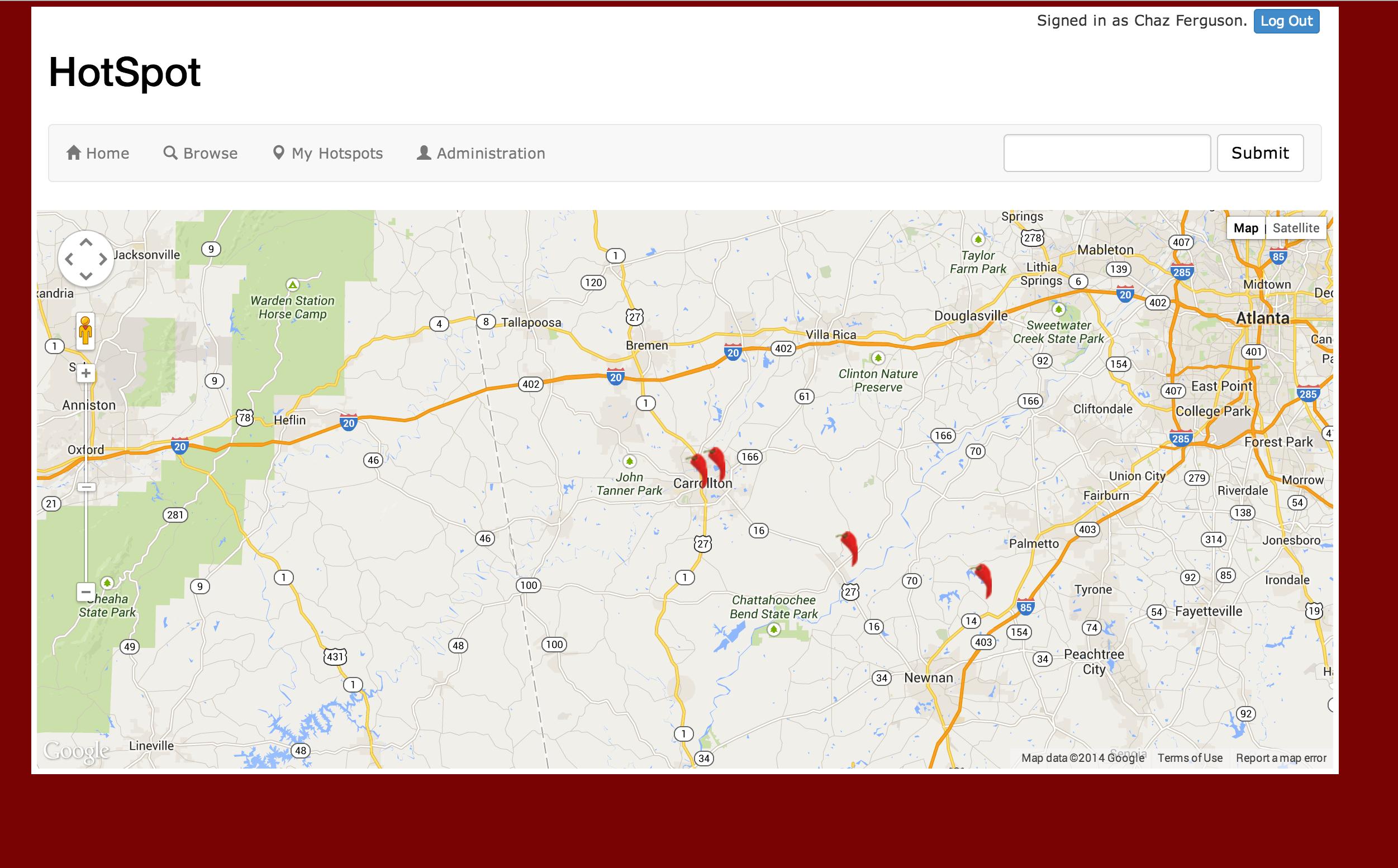 The home page is the landing page for the website and has a large google map that will center on the users location and display surrounding hotspots as peppers. It centers on the users current location. Using the search box in the menu bar, you can type an address, and center that map on the address.
