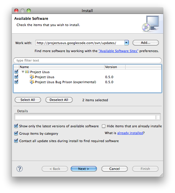 The required features "SWTChart" and "JFeet" are installed automatically, even if you do not select them.