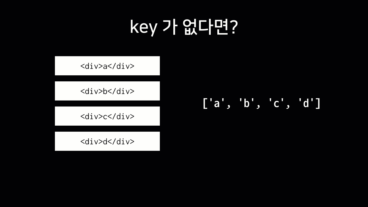 const array = ['a', 'b', 'c', 'd'];그리고 위 배열을 다음과 같이 렌더링한다고 가정해보겠습니다.