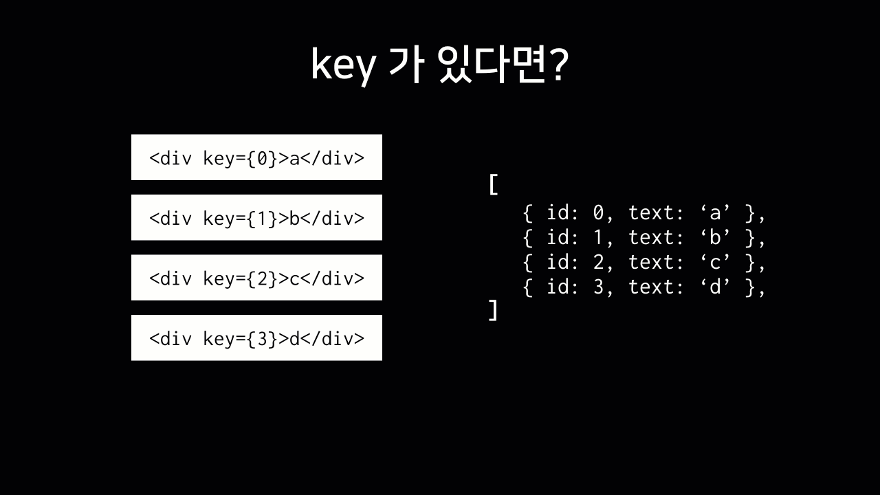 array.map(item => <div key={item.id}>{item.text}</div>);배열이 업데이트 될 떄 key 가 없을 때 처럼 비효율적으로 업데이트 하는 것이 아니라, 수정되지 않는 기존의 값은 그대로 두고 원하는 곳에 내용을 삽입하거나 삭제합니다.