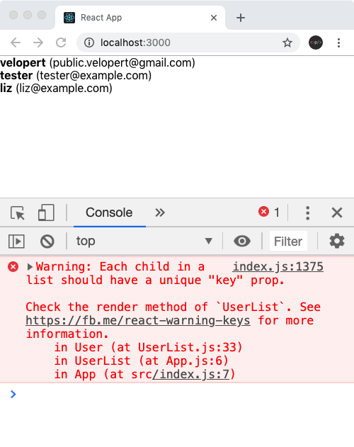 export default UserList;간단하지요? 이렇게 하면 배열의 모든 원소가 렌더링됩니다. 하지만, 여기서 끝이 아닙니다. 브라우저에서 콘솔을 열어보면 다음과 같은 에러가 보여질것입니다.