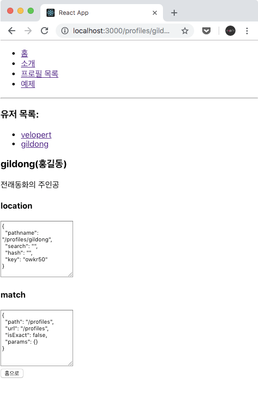export default Profiles;withRouter 를 사용하면, 자신의 부모 컴포넌트 기준의 match 값이 전달됩니다. 보시면, 현재 gildong 이라는 URL Params 가 있는 상황임에도 불구하고 params 쪽이 {} 이렇게 비어있죠? WithRouterSample 은 Profiles 에서 렌더링 되었고, 해당 컴포넌트는 /profile 규칙에 일치하기 때문에 이러한 결과가 나타났습니다.