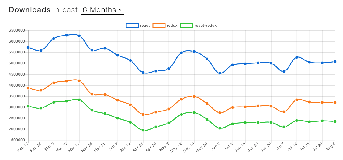npmtrends 를 통해 알 수 있는 사실은, 리액트를 사용하는 프로젝트 중 45%가 리덕스를 사용하고 있다는 것 입니다.