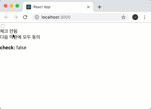 export default App;이제 yarn start 명령어를 사용하여 개발 서버를 열으신 뒤, 다음과 같이 체크 안됨 문구를 눌렀을 때 체크박스의 값이 잘 바뀌는지 확인해보세요.