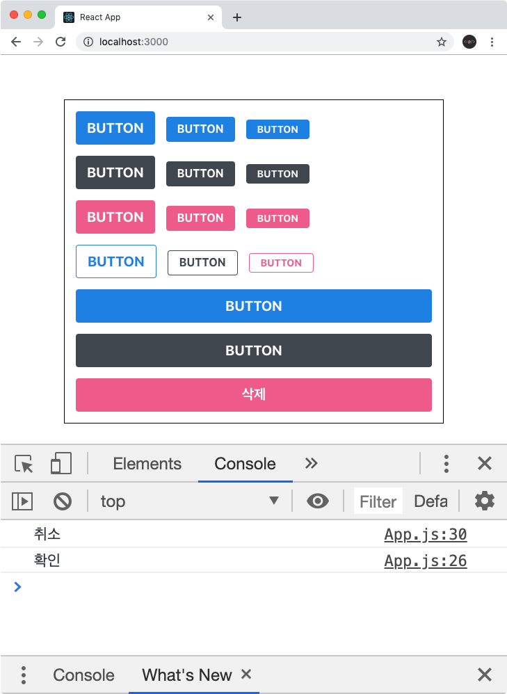 export default App;맨 아래에 있는 큰 핑크색 버튼의 이름을 "삭제" 로 변경 후 해당 버튼을 누르면 우리가 만든 Dialog 가 보여지도록 설정을 했고, Dialog 에 onConfirm, onCancel, visible 값을 전달해주었습니다.