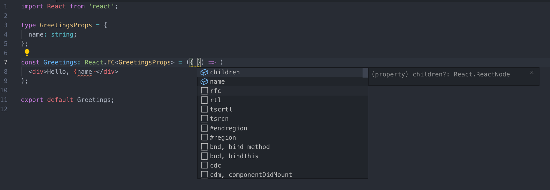 export default Greetings;React.FC 를 사용 할 때는 props 의 타입을 Generics 로 넣어서 사용합니다. 이렇게 React.FC를 사용해서 얻을 수 있는 이점은 두가지가 있습니다.