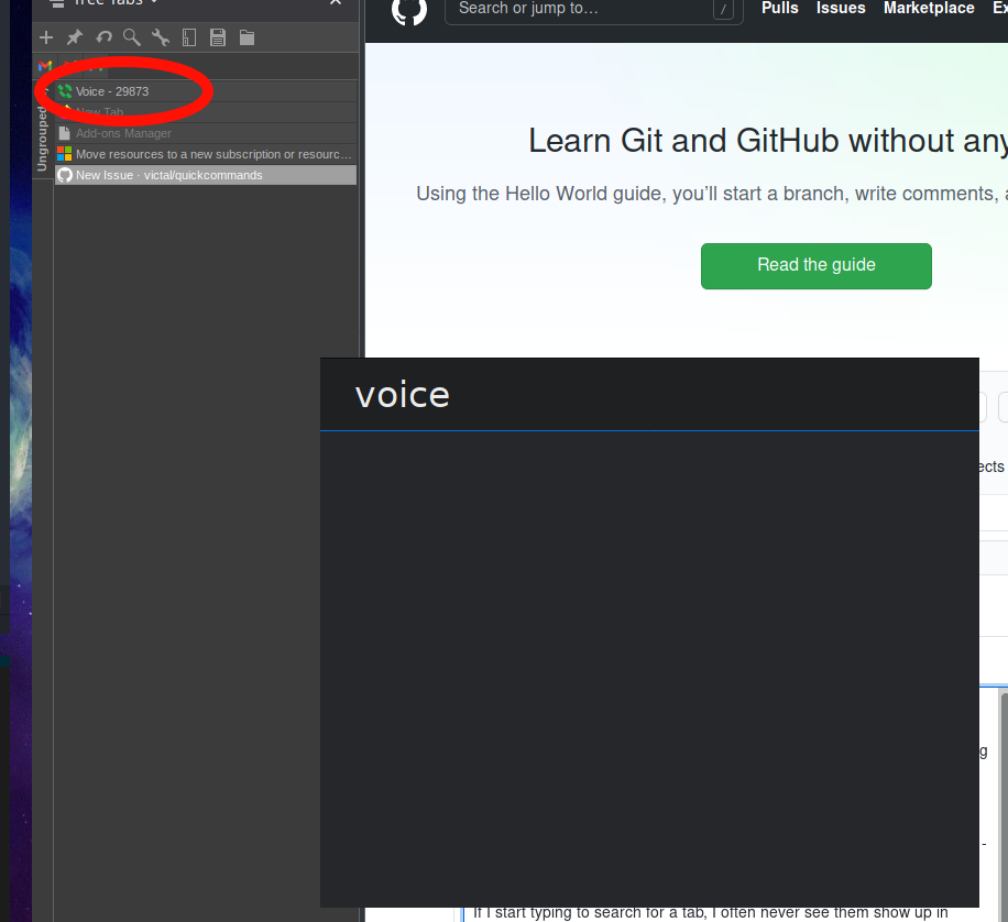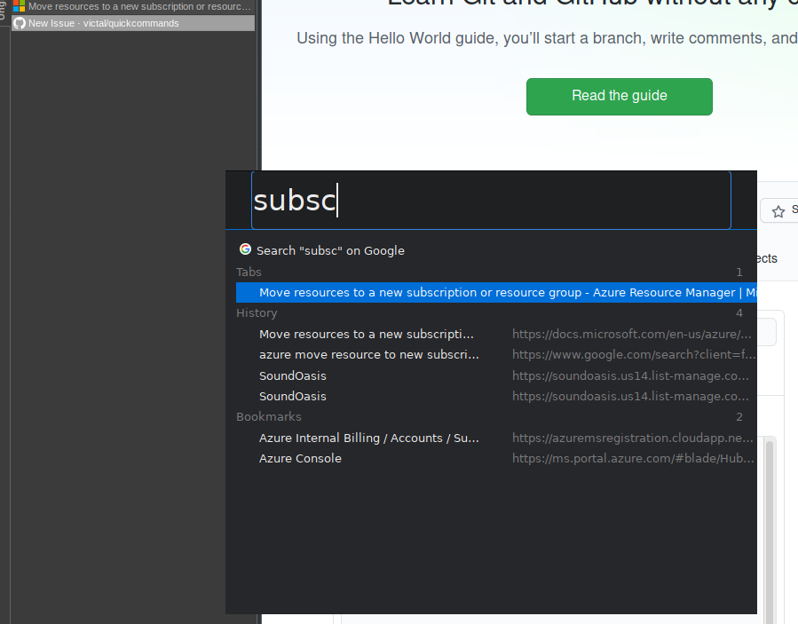 I am experiencing either no or unexpected search results when attempting to use quick commands. When I open it, the first thing I would expect to see is a list of currently open tabs. What I actually see is nothing at all: