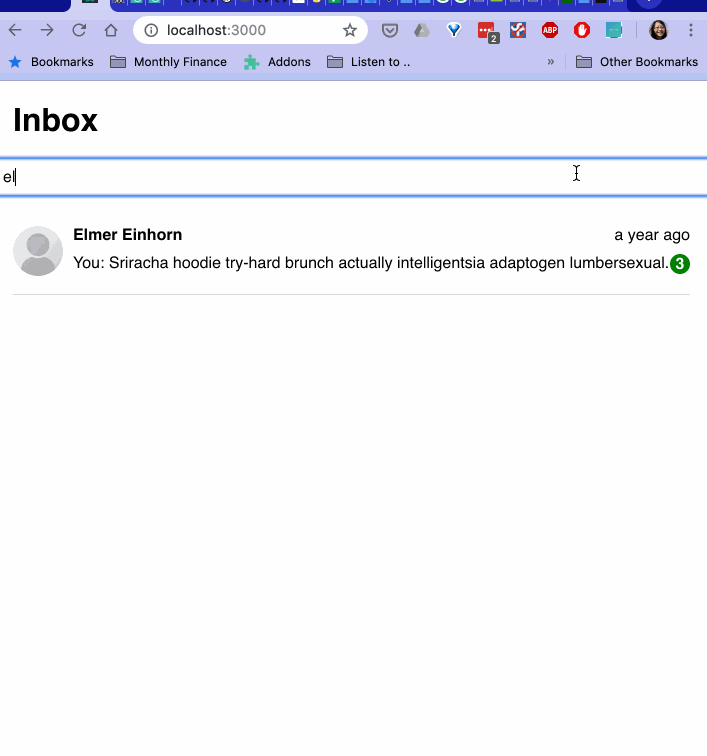 Built as a functional, standalone React app that displays a set of conversations, each with a series of messages between two parties. Assumed the person viewing the app is one of the participants in each conversation (no support for multiple users yet).