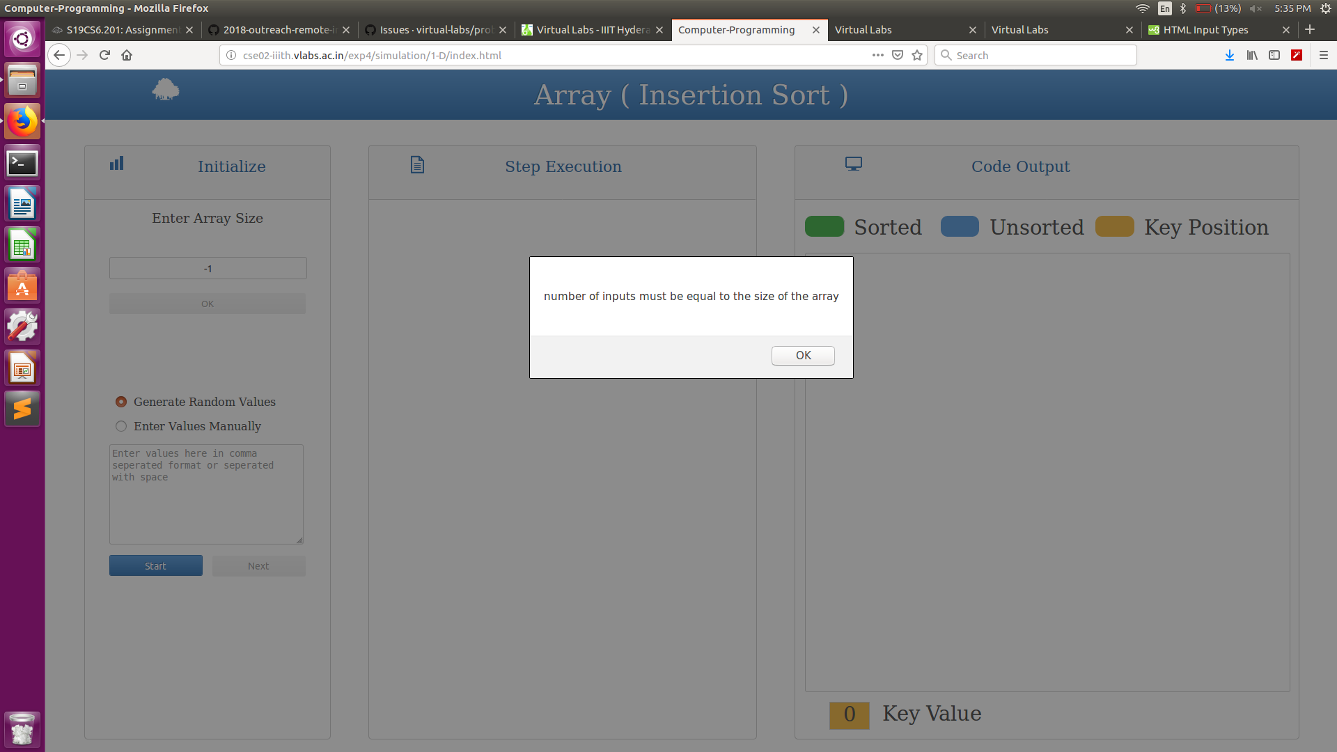 if array size is given negative it gives pop up number of elements must be equal to size of array. But it should pop up as an invalid size value.