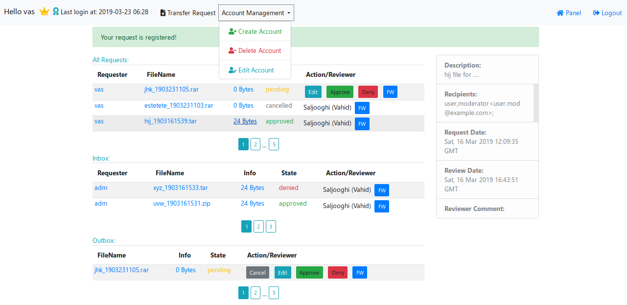 File transfer web application facilitates file transfer from one computer network to a second computer network. The user can upload a compressed file from his/her own panel on source network and then download the same file in a destination network or he/she can put other recipients as downloader of the file in the destination network. This web app is handy in air-gapped environments with limited access(no Internet, closed USB ports and etc) for transferring file to an open access computer network (The web app acts as a gatekeeper between two networks). It provides the capability for account management(create, edit, delete, block account) and request management(approve, cancel, deny, edit, forward). The file transfer request shall be reviewed by a reviewer and in case of approvement, the requester can download the file.