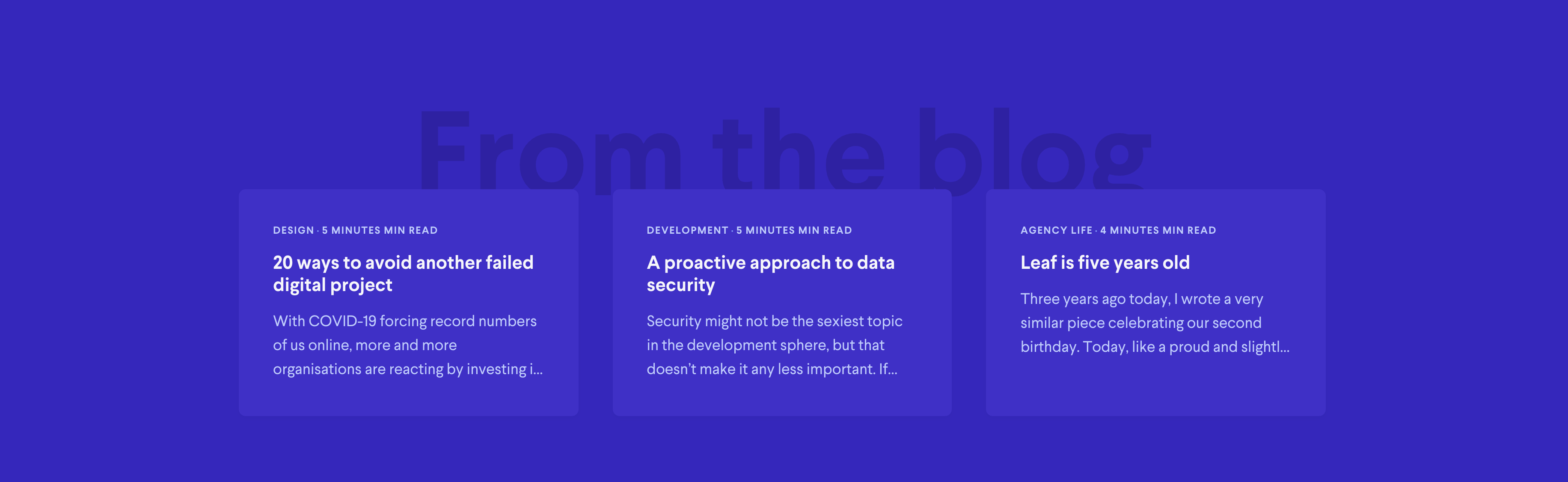 On the pages where this blog preview grid is used, the background heading 'From the blog" (or "Keep reading"), is the only item on the page (And on the site) causing an accessibility issue, due to the low contrast it has against the background.